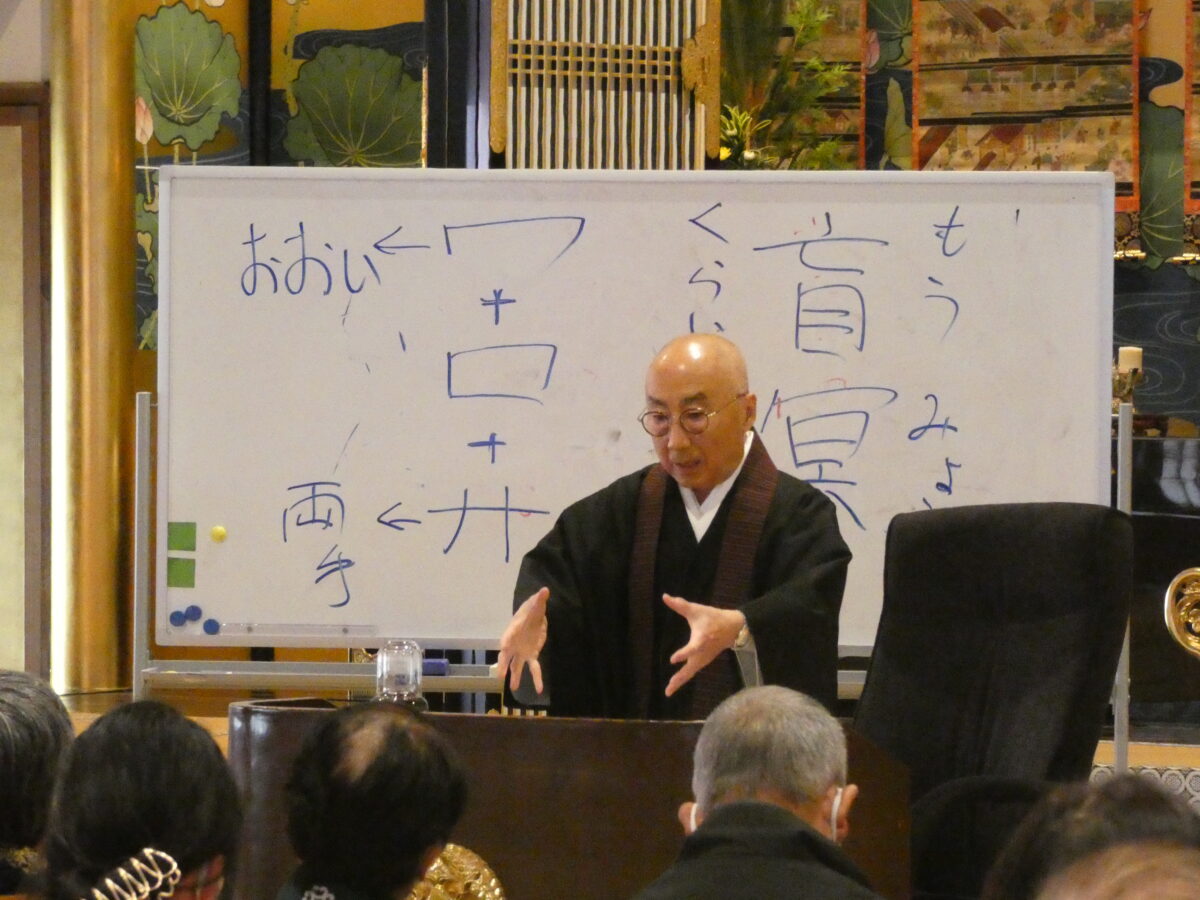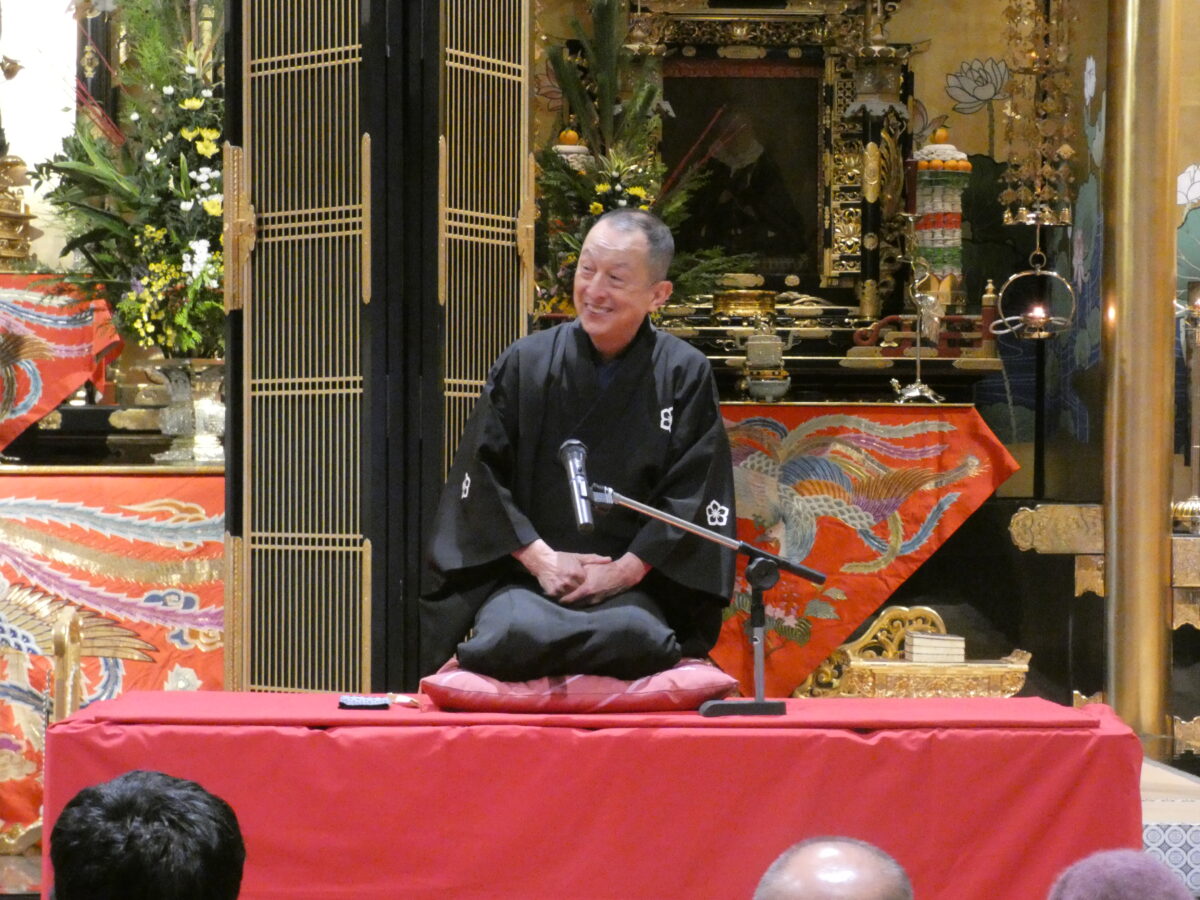 13日は、「初逮夜のつどい」と題した讃仰のつどいがもたれ、落語家の露の新治氏による「お笑い人権高座」が開催されました。また、法話講師に四衢亮氏(岐阜高山教区 不遠寺住職)をお迎えし、報恩講の歴史を紐解き、あらためて宗祖親鸞聖人が残されたお言葉にふれながら、その教えは私たち一人に向けられた呼びかけであることをお話いただきました。